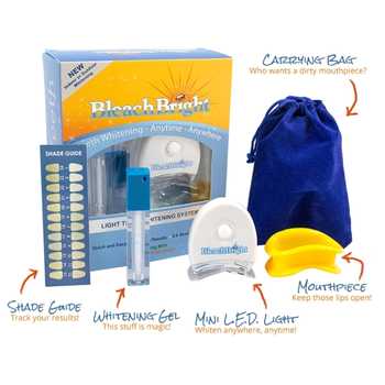 Get a brighter smile anytime, anywhere with BleachBright Teeth Whitening. This convenient kit allows you to whiten your teeth indoors or outdoors, whether you're relaxing in the tanning bed, enjoying natural sunlight, or using the included at-home LED light.