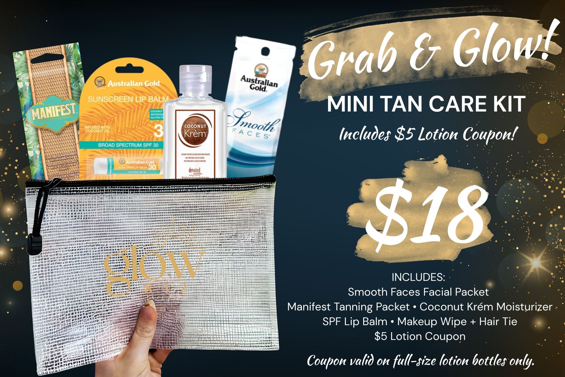 The perfect little add-on for your tan routine! Our Grab & Glow Bags are packed with mini essentials to keep your skin hydrated, smooth, and glowing.